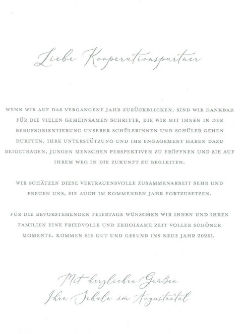 Weihnachtsgrüße der Schule im Augustental 2025 für alle externen Partner der Berufsorientierung