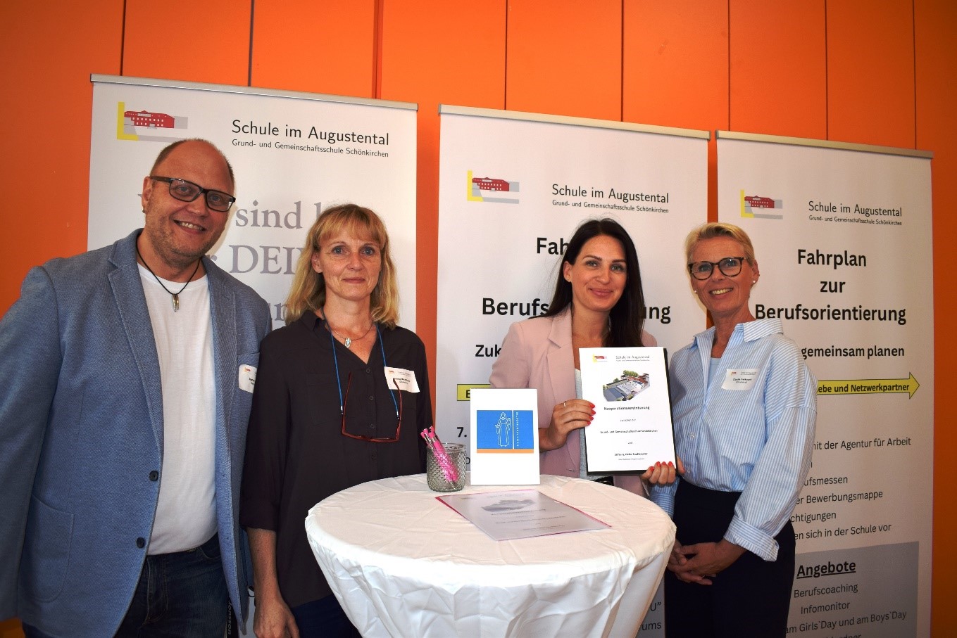 Mit dem Kieler Stadtkloster konnte ein neuer Kooperationspartner für die Berufsorientierung im Schönkirchener Schulzentrum gewonnen werden (v.l. Berufscoach Ingmar Jonsson, Schulleiterin Solveig Märzhäuser, Janina Frohbös/Stadtkloster und Fachlehrkraft Claudia Freickmann). © CK