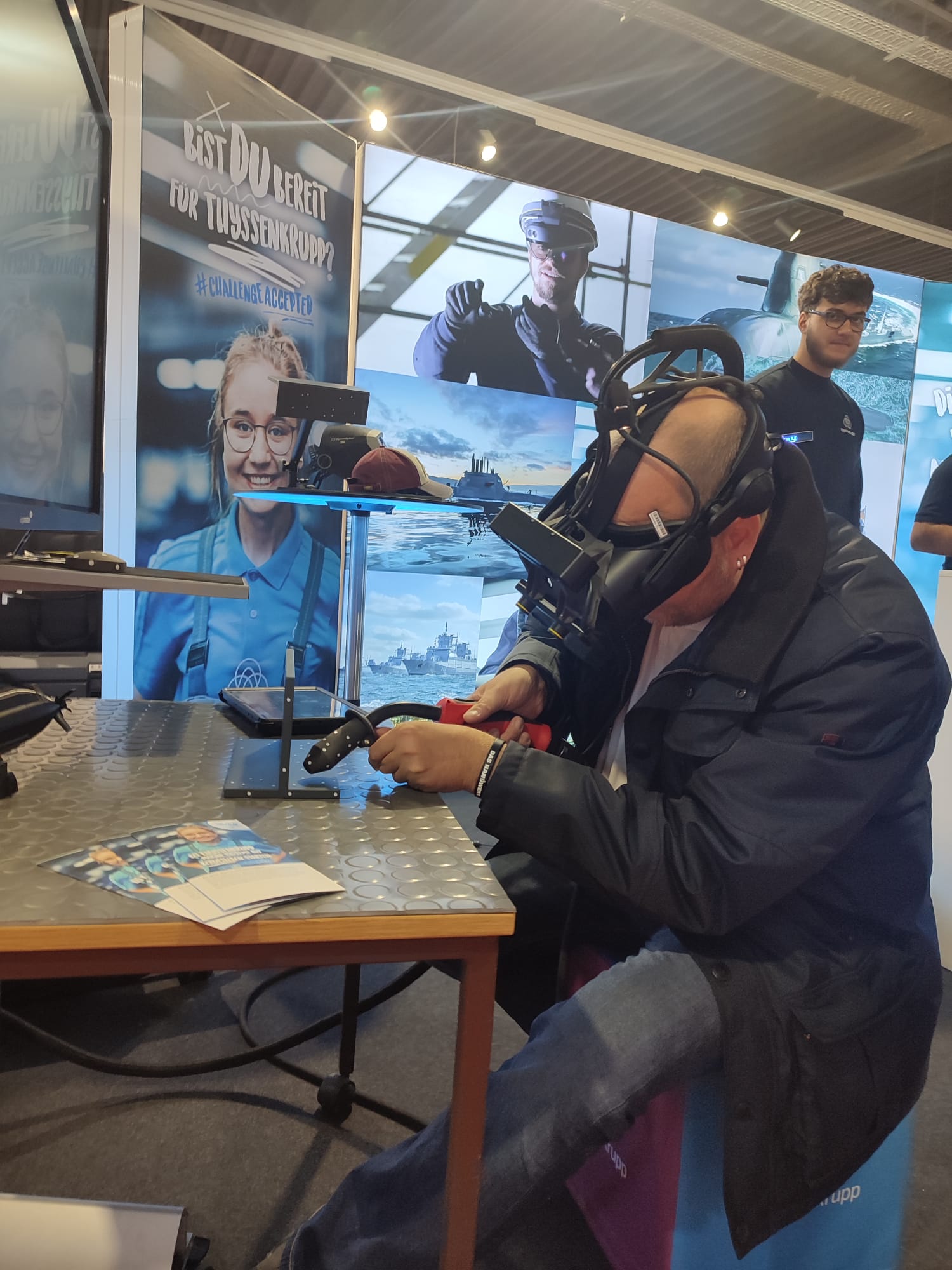 Das Bild zeigt Ingmar Jonsson beim virtuellen Schweißen am Stand von thyssenkrupp Marine Systems.