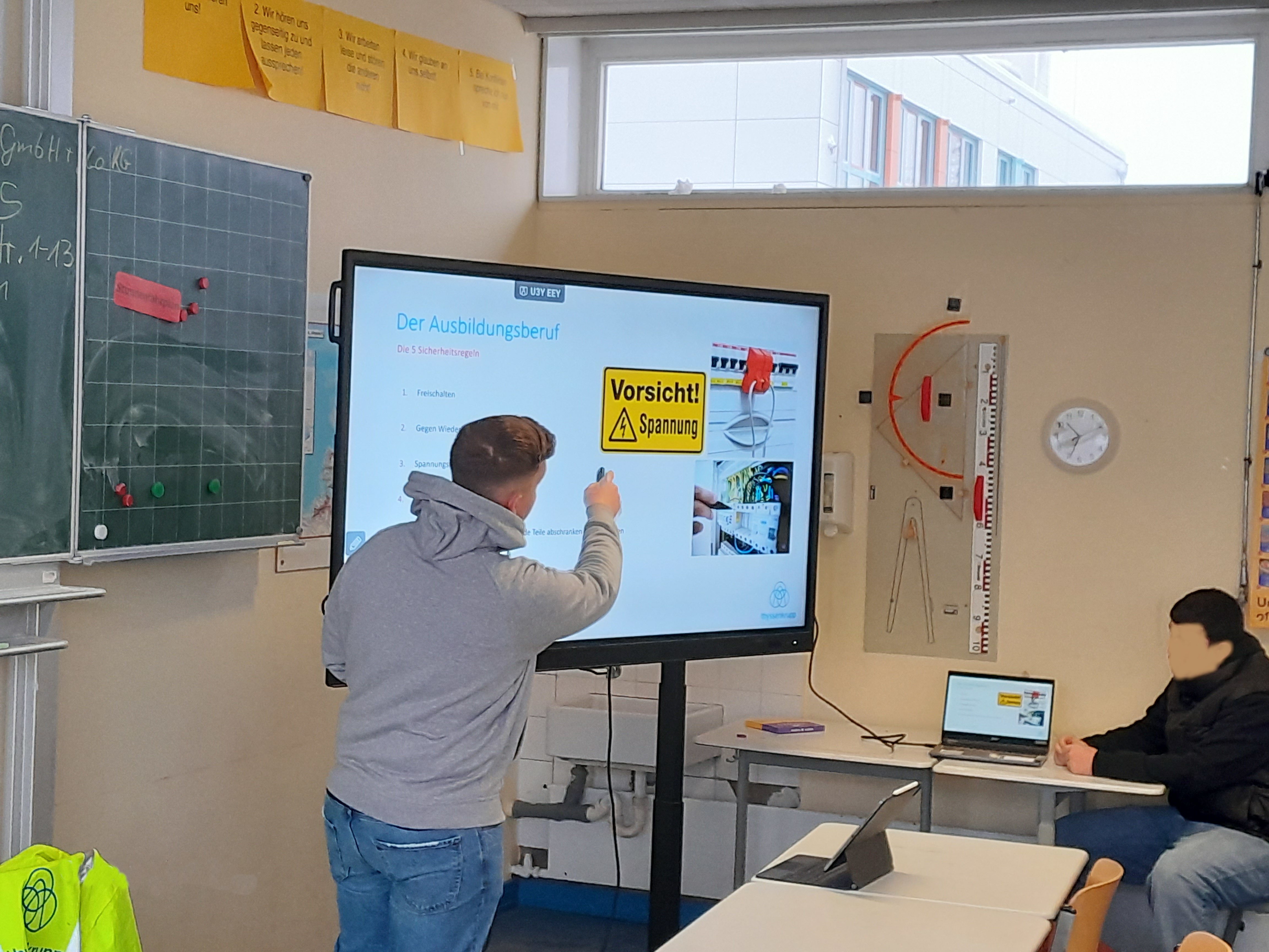 Am 06.12.2023 stellten die beiden ehemaligen Schüler unserer Schule, Demir und Defran, gemeinsam mit der IHK Kiel (vertreten durch die Koordinatorin für Ausbildungsbotschafter*innen Frau Verges) ihre Ausbildungsberufe Elektroniker & Industriemechaniker vor und beantworteten die zahlreichen Fragen der Schülerinnen und Schüler.