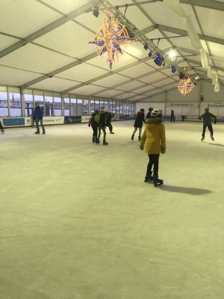 Wir bekamen die notwendige Ausrüstung und bereits nach wenigen Sekunden waren die Ersten pünktlich um 08:30 Uhr auf dem Eis und zeigten ihre Künste. Während einige von uns das erste Mal auf dem Eis standen und sich langsam an der Bande Stück für Stück voran tasteten, drehten andere Pirouetten und wieder andere versuchten Kunststücke auf dem Eis. Aufgrund der frühen Zeit hatten wir das große Glück, dass wir die Bahn fast für uns alleine hatten.