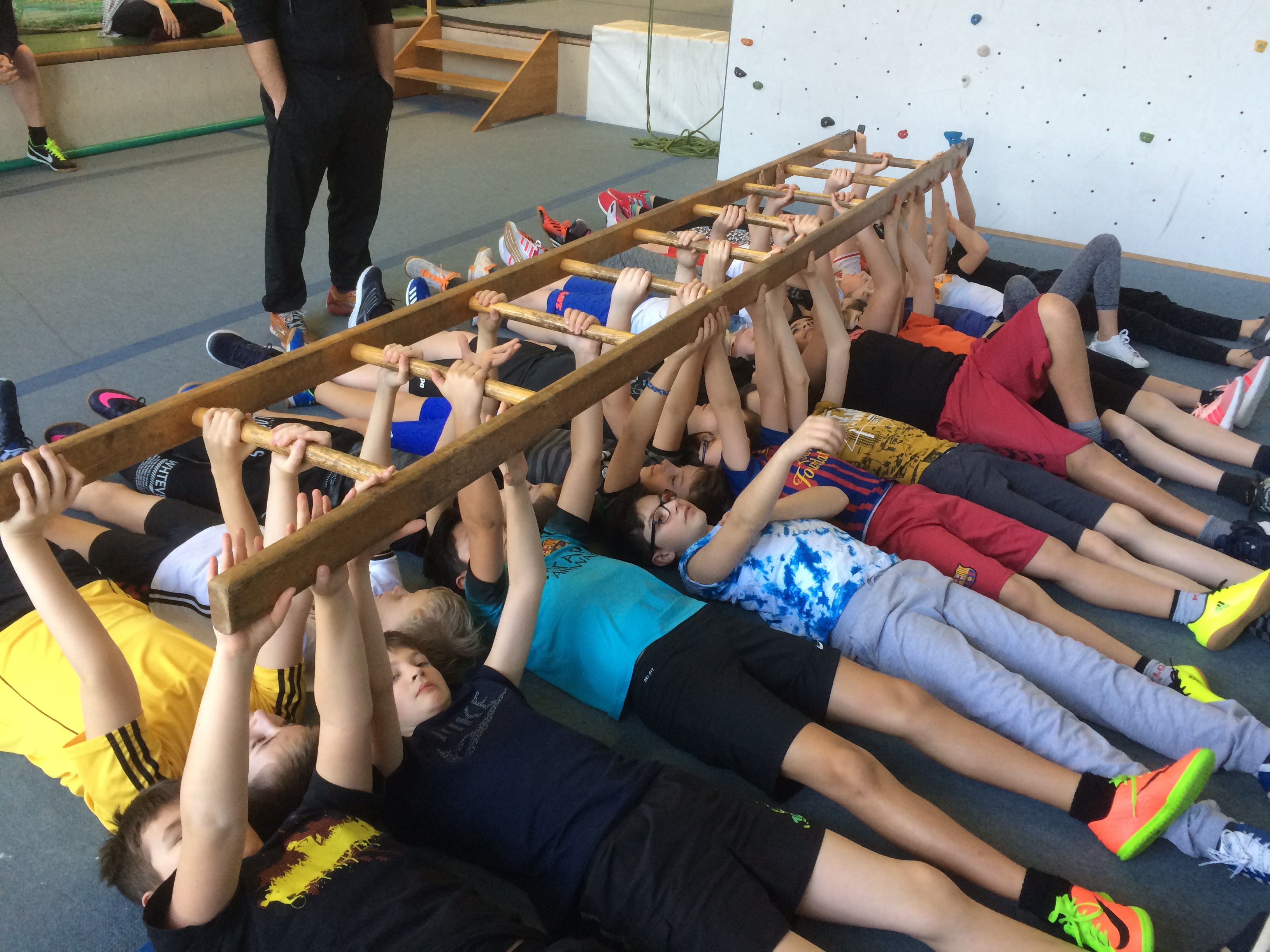 Wie schwer es manchmal ist, sich in einer größeren Gruppe aufeinander abzustimmen, fiel uns besonders bei einer Übung auf. Wir lagen Kopf an Kopf mit dem Rücken auf dem Boden und sollten mit gestreckten Armen eine Leiter in verschiedene Richtungen führen und drehen. Spätestens als uns die Leiter zugeworfen wurde, waren wir schockiert und uns wurde bewusst, dass wir ohne eine gemeinsame abgestimmte Unterstützung nicht weiterkommen.