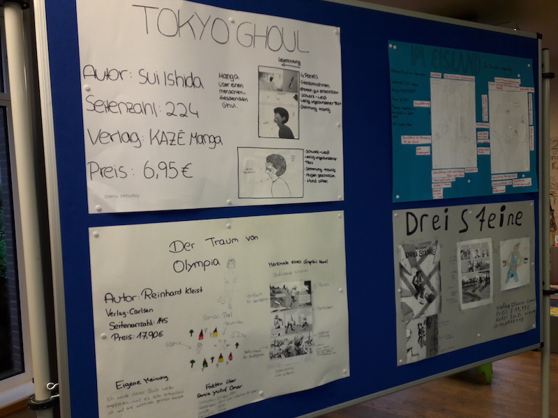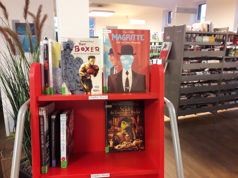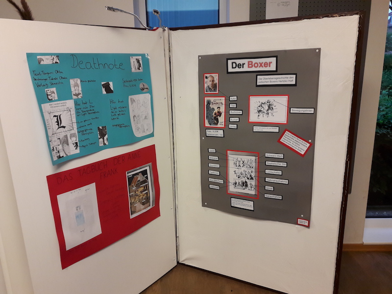 Frau Irion aus der Gemeindebücherei war sofort für die Idee zu gewinnen, eine Ausstellung zu dem Thema zu machen und so die Plakate zu honorieren. Nicht zuletzt wird es nun in der Bücherei auch eine Graphic Novel Abteilung geben.