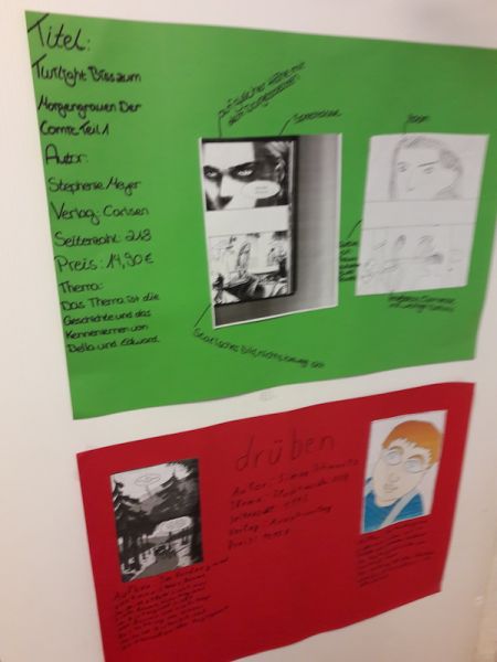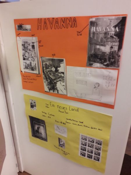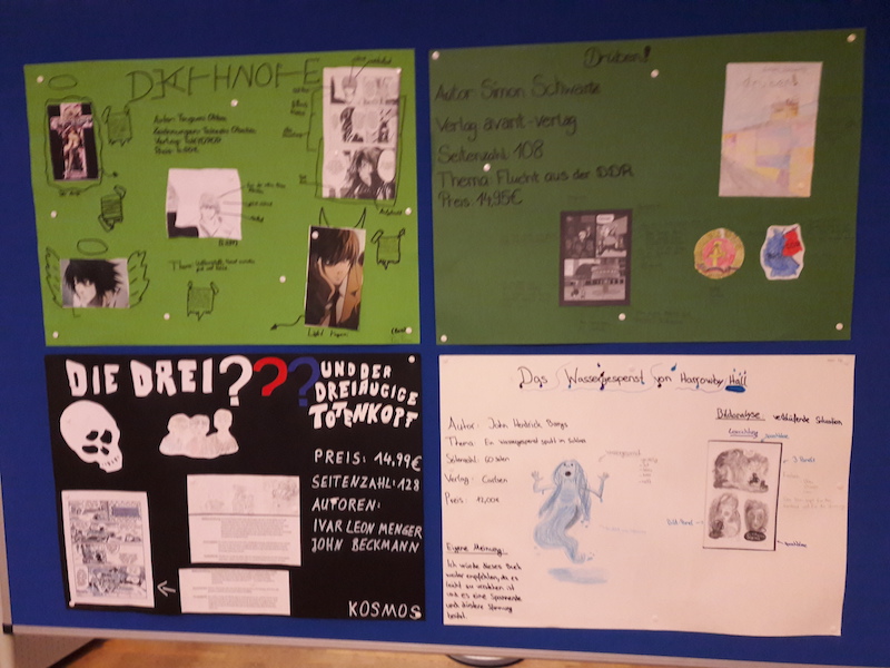 Aufgabe war es dann eine Lesemappe und Plakat zu erstellen. Dabei durfte auch kreativ gearbeitet werden. Die 9b konnte ihre Erfahrungen aus dem Comic Workshop aus März 2019 in der Kunsthalle zu Kiel nutzen und die 9a bekam auch einen Schnellzeichenkurs im Unterricht, an welchem sie sichtlich Spaß hatten. Die Aufgaben aus der Lesemappe wurden dann erwartungsgemäß nicht von allen so freudig bearbeitet (Schülerstimmen: "oje, eine Charakteristik" oder "oh nein, eine Bildanalyse"), wobei es aber tolle Resultate gab.