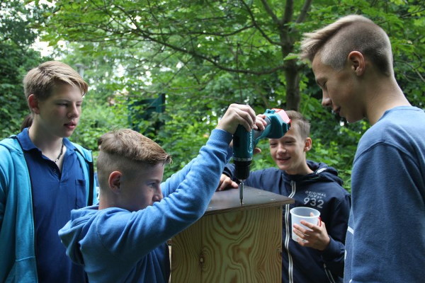 Schülerinnen und Schüler des Wahlpflichtkurses 8 „Biologische Experimente“ der Schule im Augustental beschäftigten sich im letzten Schuljahr unter anderem mit Wildbienen. Dabei lernten sie zum Beispiel, dass es viele Bienenarten gibt, die solitär, das heißt einzeln leben. Um diesen Wildbienen zusätzliche Nistmöglichkeiten zu bieten, wollten sie ein Insektenhotel bauen, und damit die vorhandenen Wildbienenhotels am Naturlehrpfad ergänzen. Das Hotel sollte in Schulnähe am Feuerlöschteich, an dem es bereits einmal Nisthilfen gegeben hatte, aufgestellt werden.