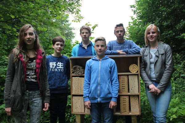 Tatjana, Kjell, Torben, Noah, Fynn und Melina vor dem gerade aufgestellten Wildbienenhotel.