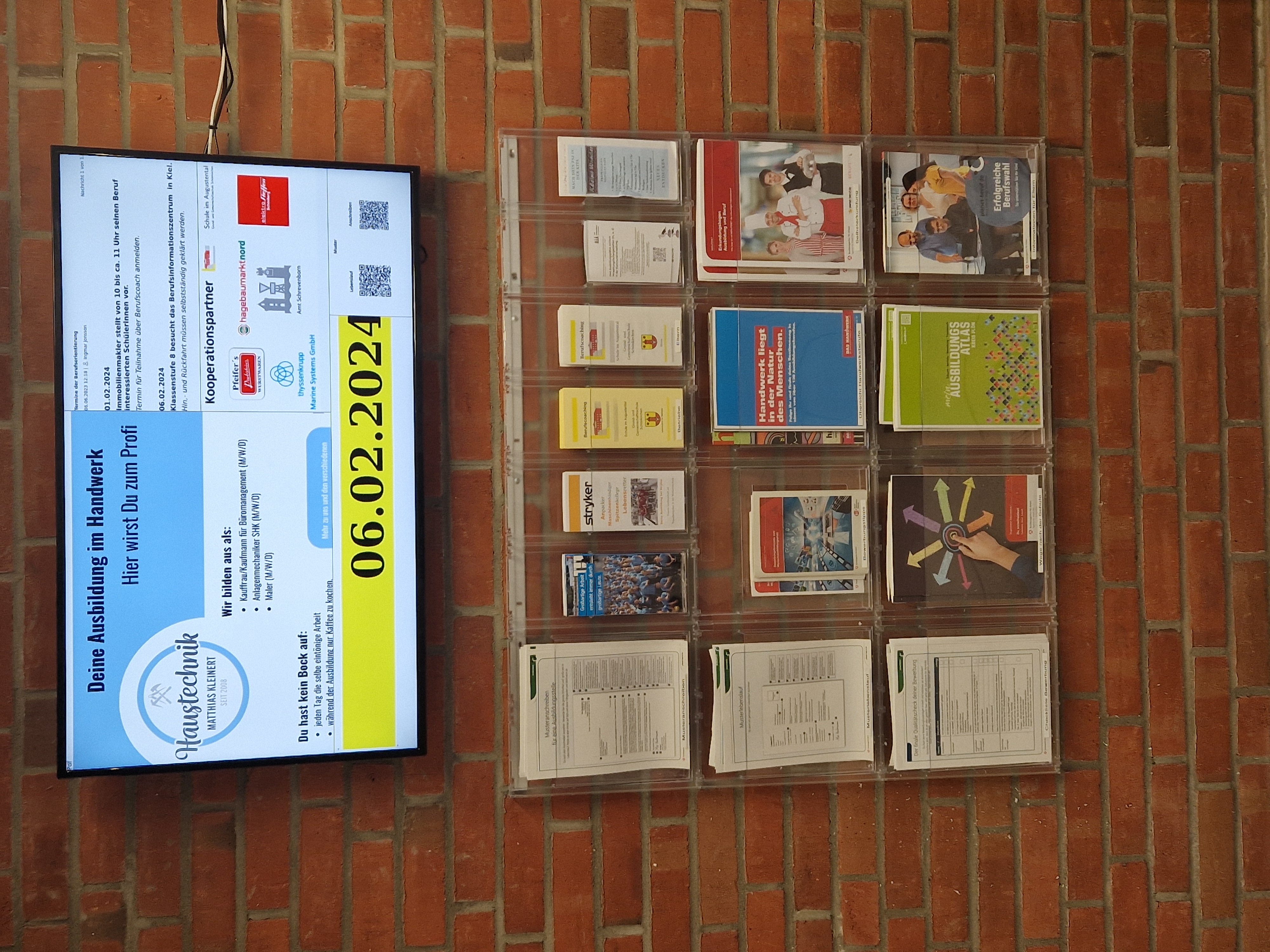 Die Schule im Augustental bietet Betrieben, Einrichtungen und Behörden an, freie Ausbildungsstellen als Steckbrief (.pdf Hochformat, am besten mit QR-Code) zur Darstellung auf unserem Infomonitor in der Pausenhalle der Abgangsklassen darstellen zu lassen.