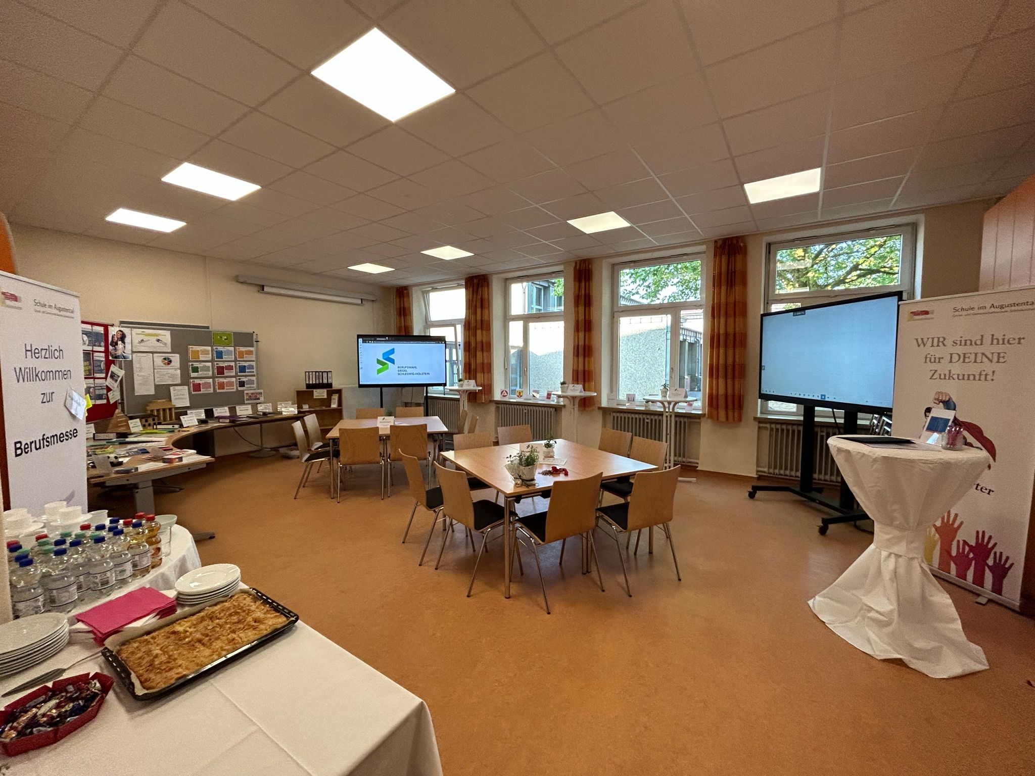 Ein Infomonitor in der Pausenhalle, der auch auf der Homepage der Schule einzusehen ist, informiert regelmäßig und aktuell über alle anstehenden Termine und über freie Ausbildungsplätze.
